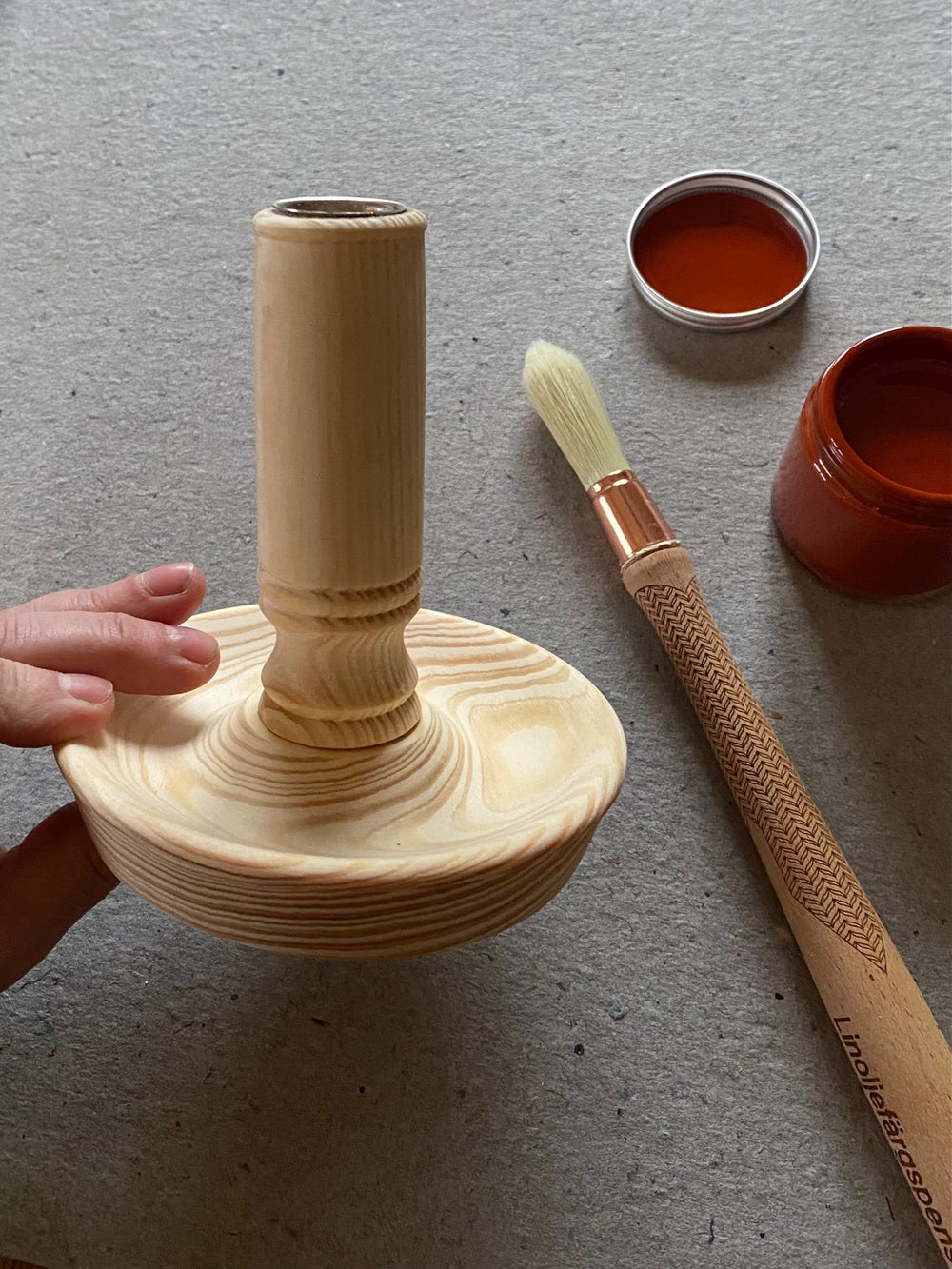 Allt i ett - presentbox - handsvarvad nattljusstake, pensel och linoljefärg