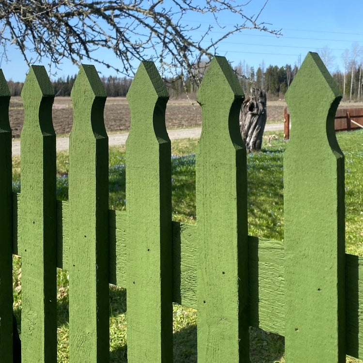 Slamfärg med kraftigt skogsgrön kulör. Lika härlig på husfasaden som på staketet eller odlingslådorna. Slamfärgen innehåller några procent kokt linolja.